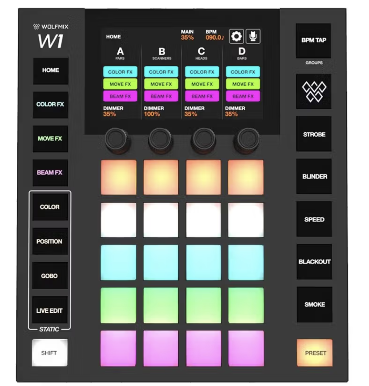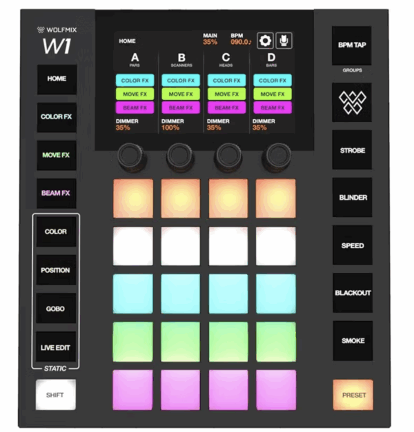 The Wolfmix W1 is a professional standalone DMX lighting controller, perfect for live events, DJs, and productions that demand flexibility and reliability. With its intuitive interface, touch-sensitive pads, and built-in effects, you can control moving heads, washes, strobes, and more – all without external software.