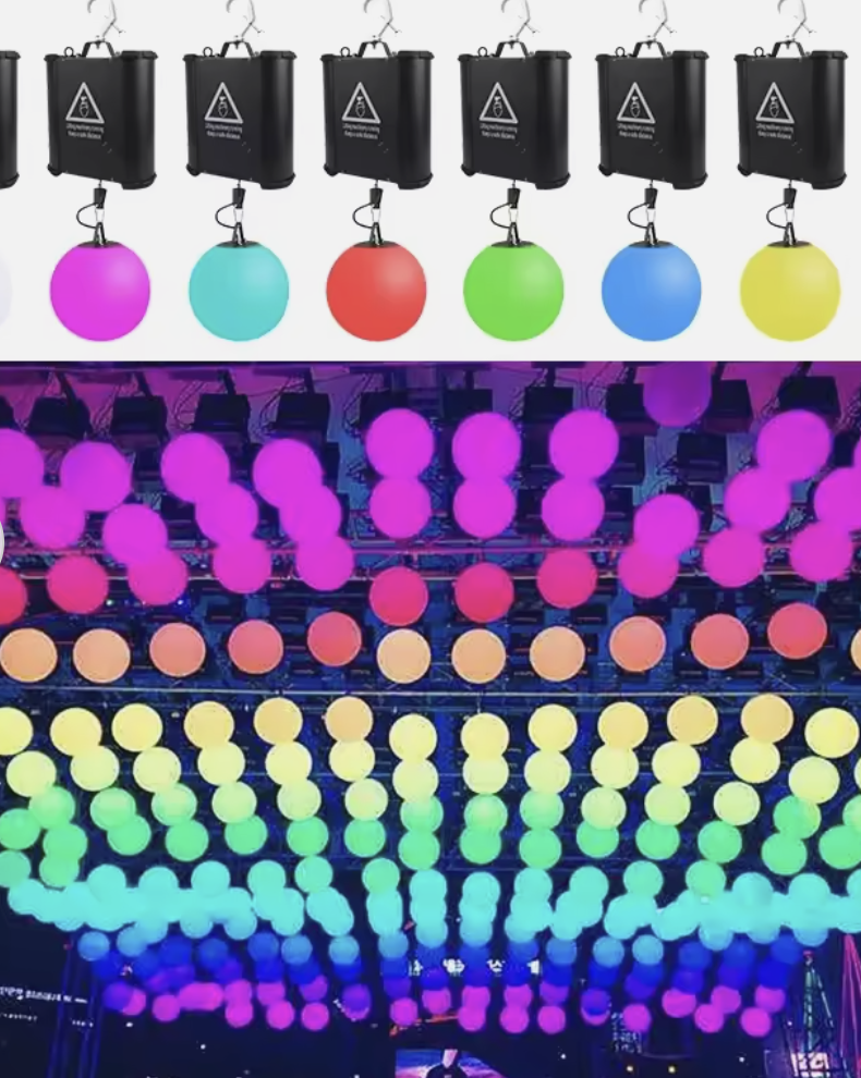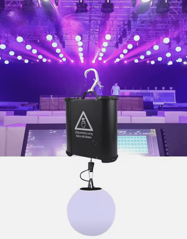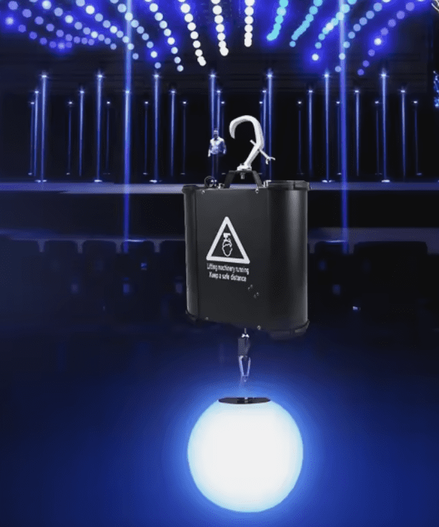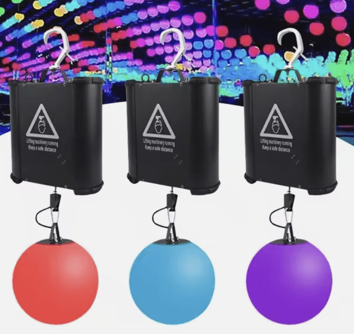 Each illuminated sphere is suspended from a motorised winch allowing precise vertical movement combined with programmable lighting effects. When synchronised across multiple units, the system creates a spectacular kinetic lighting display.